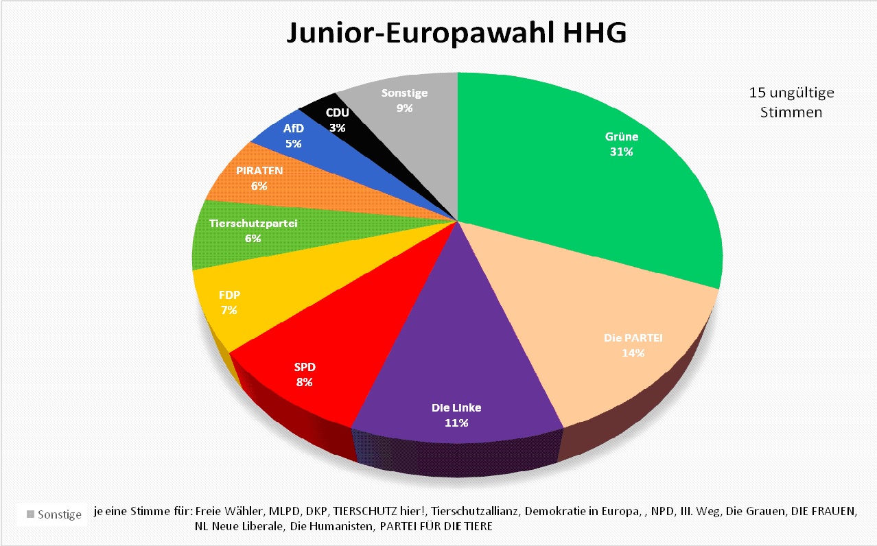 Hier gibt es die Ergebnisse der Juniorwahl zum Europaparlament. Gewählt haben an unserer Schule die 9. und 10. Klassen und der 11er Kurs Sozialkunde. Weiter unten gibt es dann noch das Wahlergebnis der Juniorwahl in Gesamtdeutschland. Ein Vergleich lohnt sich natürlich auch mit den Ergebnissen der realen Wahl zum EU-Parlament.