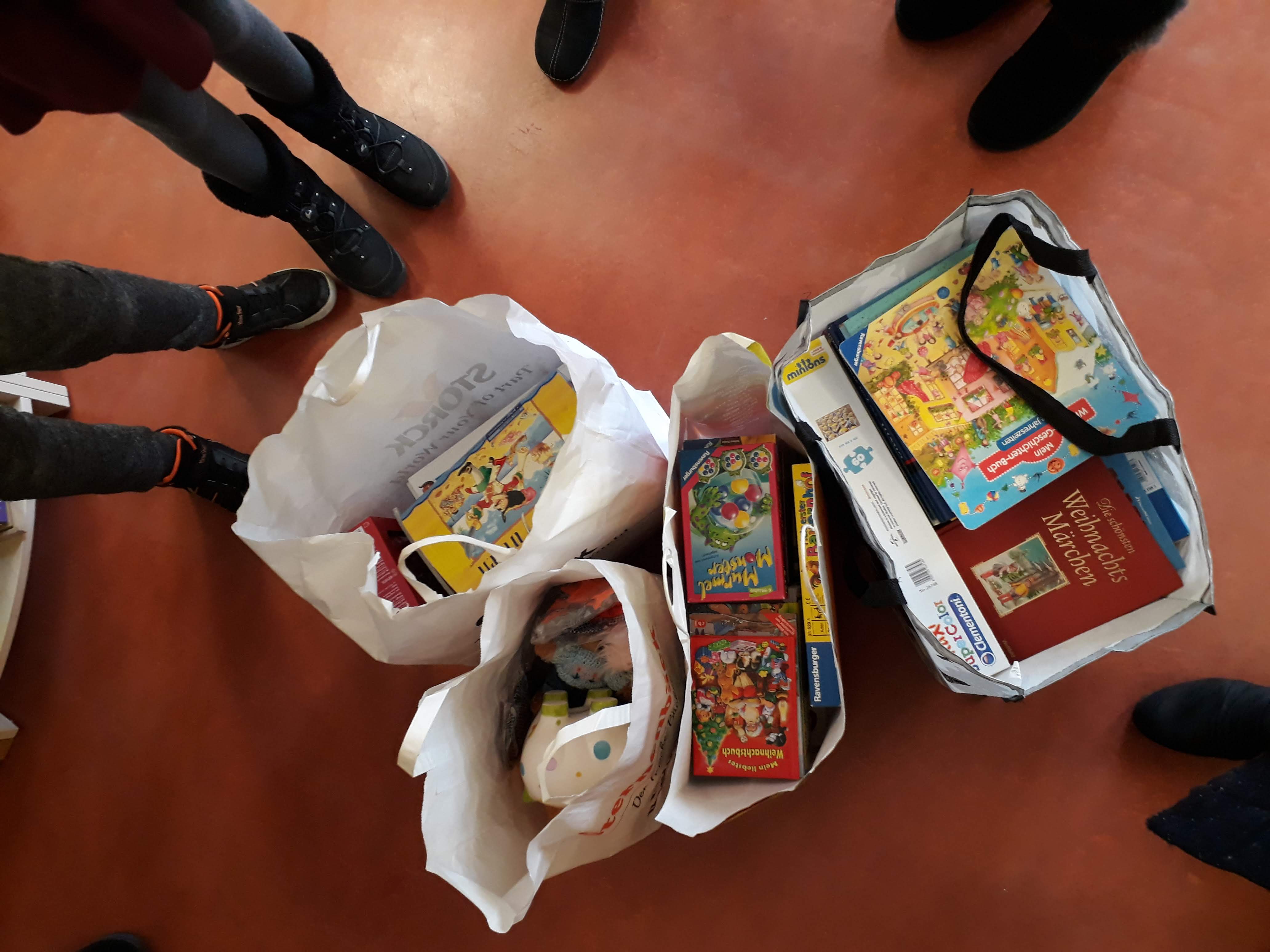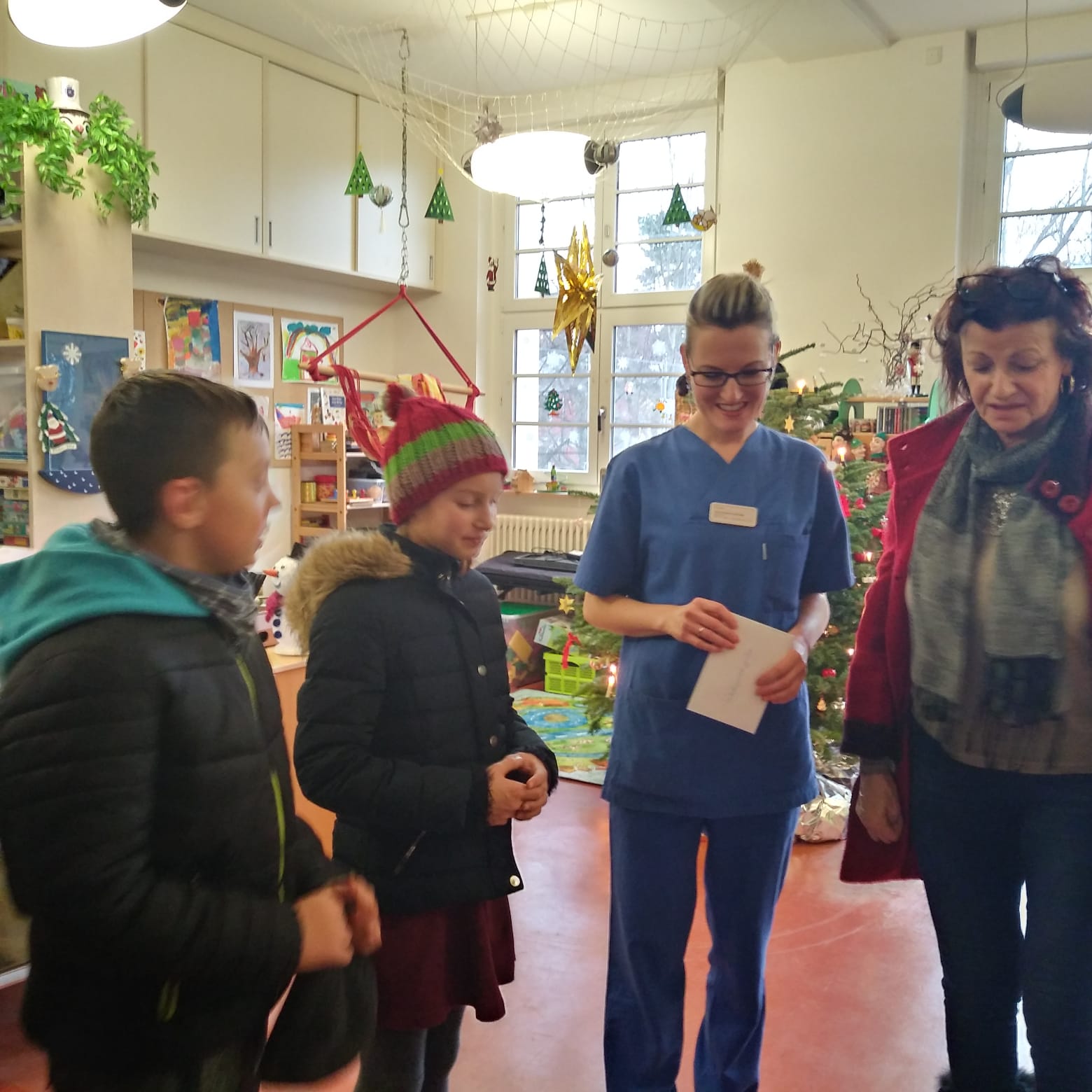 Weihnachtszeit ist die Zeit der Liebe, Freude und Großzügigkeit. Auch wir wollten unsere Vorfreude auf das Weihnachtsfest mit anderen Kindern teilen. Am 20.12. besuchten einige Schüler der Klasse 0501, Eltern sowie unsere Klassenleiterin Frau Seliger die Kinderkrebsstation im Helios-Krankenhaus. Bereits vorher hatten wir in der Klasse eine Spendenaktion durchgeführt, die recht erfolgreich war. Also hatten wir viele interessante Sachspenden im Gepäck, aber auch eine ansehnliche Geldspende. Die Bäckerei Thieme hatte eine ganz besondere Überraschung – ein riesiges Pfefferkuchenherz.