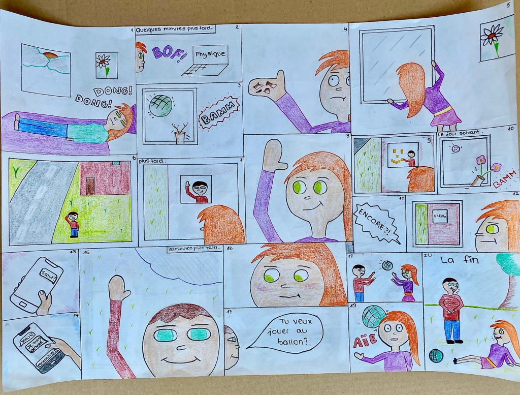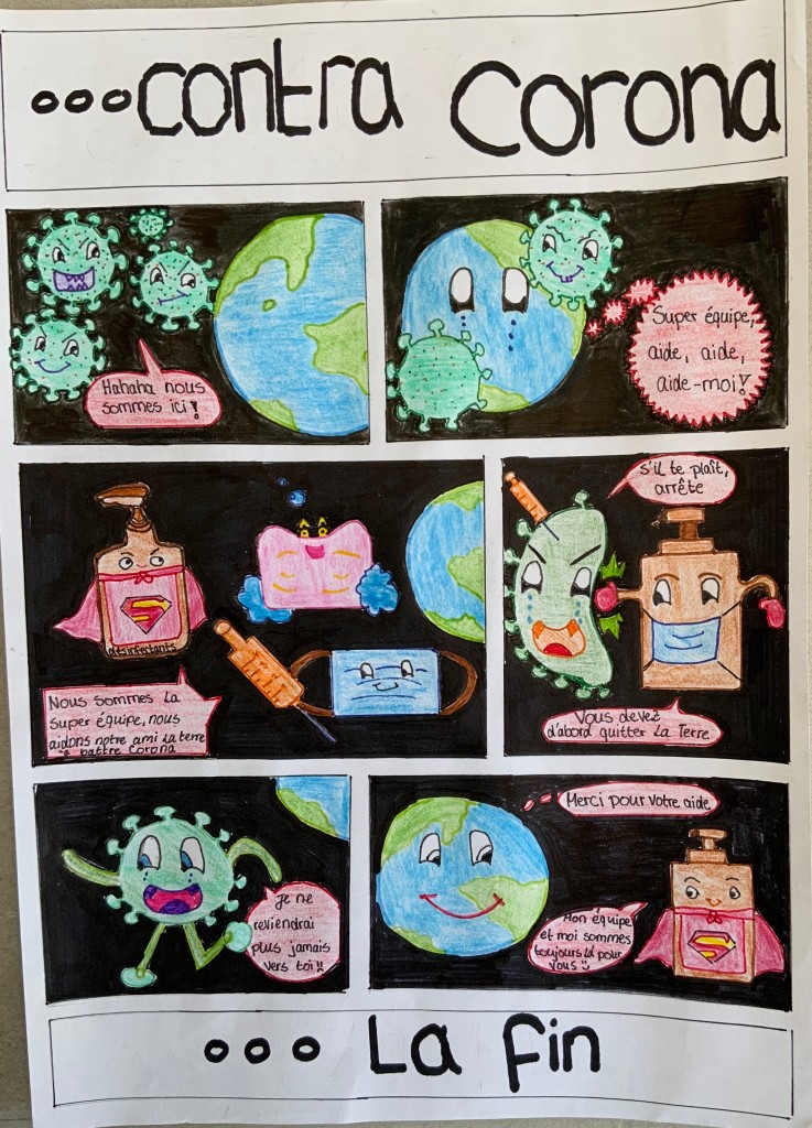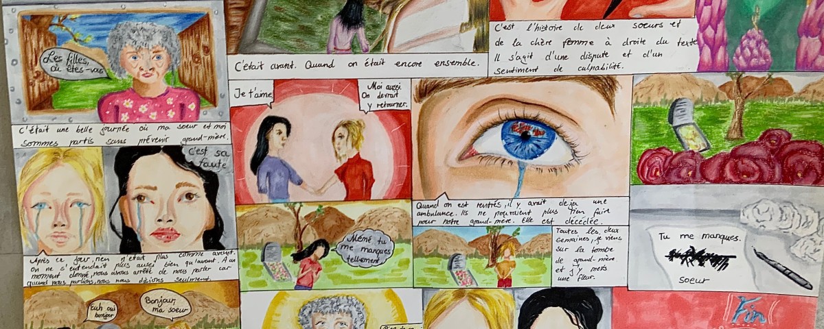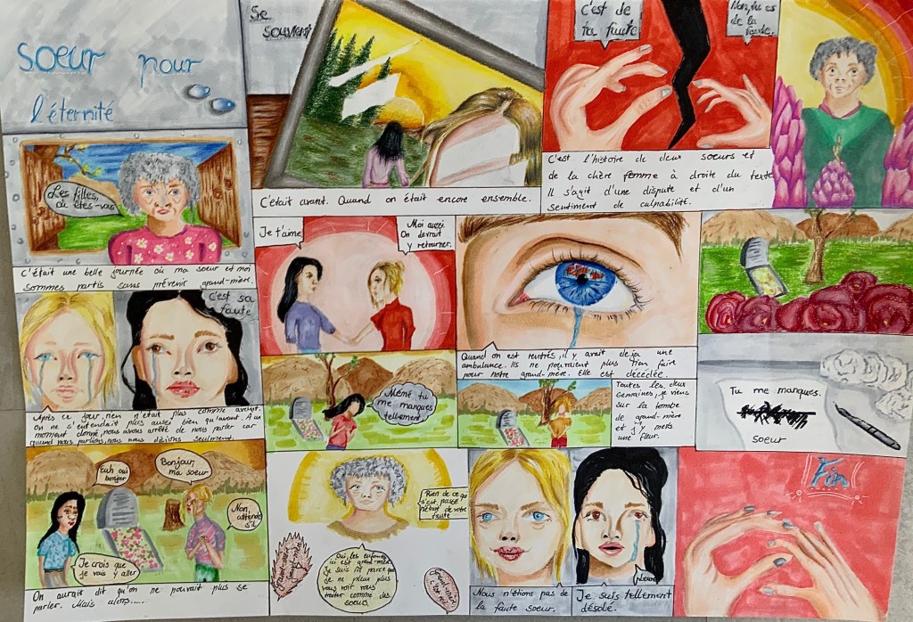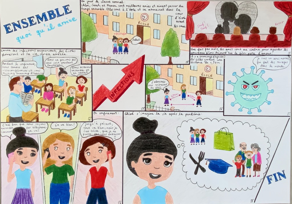 Durch einen fächerübergreifenden Unterricht (Kunst und Französisch) standen uns Frau Heller und Herr Philipp jederzeit mit Rat und Tat zur Seite. Deswegen gelang es allen Schüler und Schülerinnen in der diesjährigen Runde, wundervolle Comics zu kreieren, die sich mit der Thematik “Ensemble” (Zusammen) auseinandersetzten.