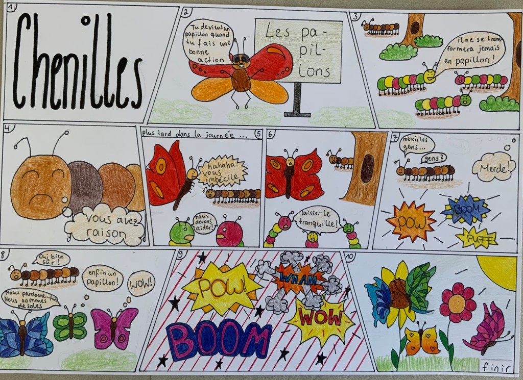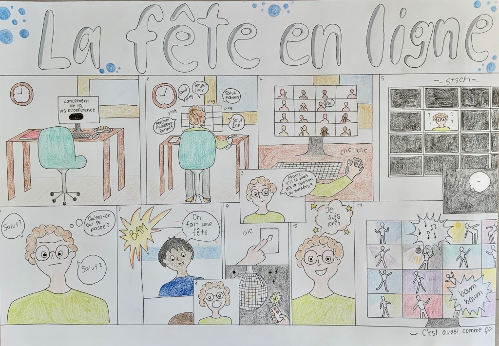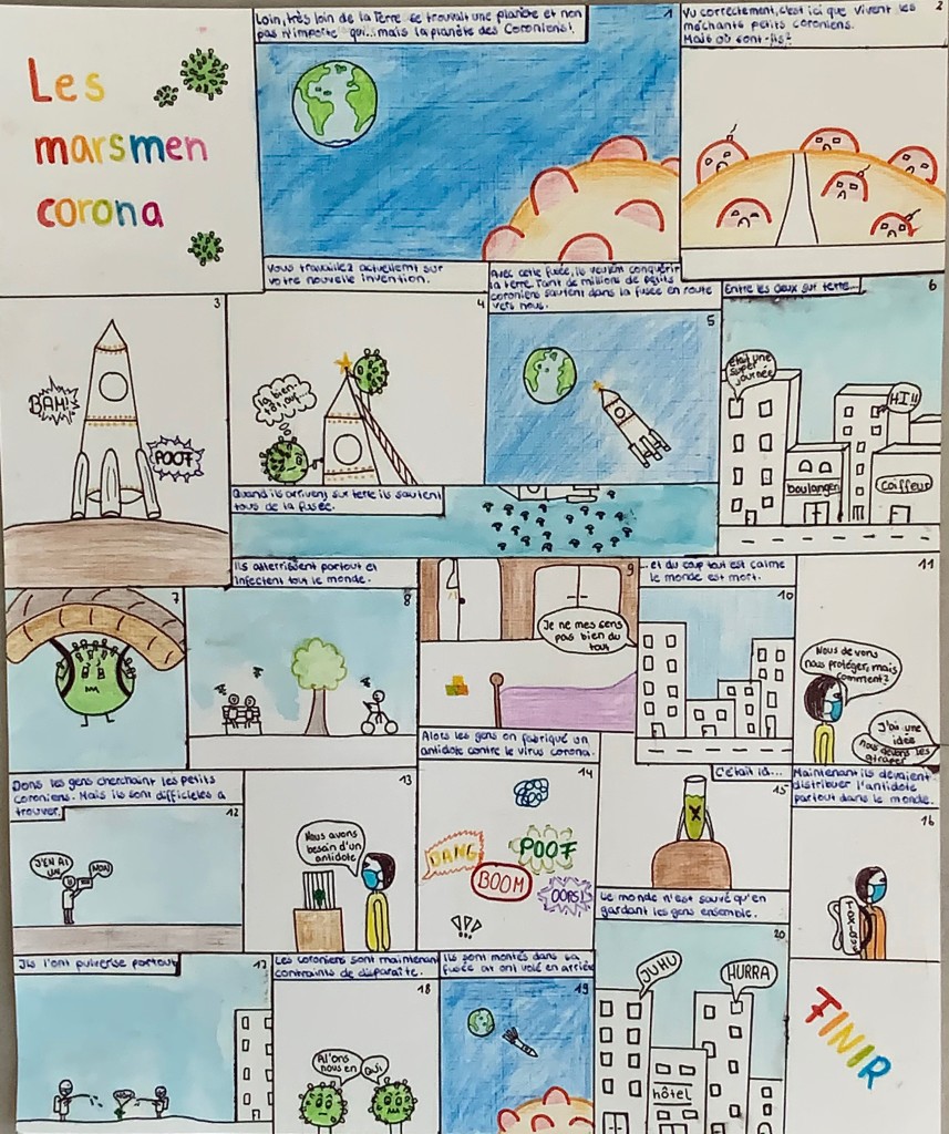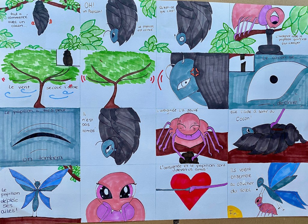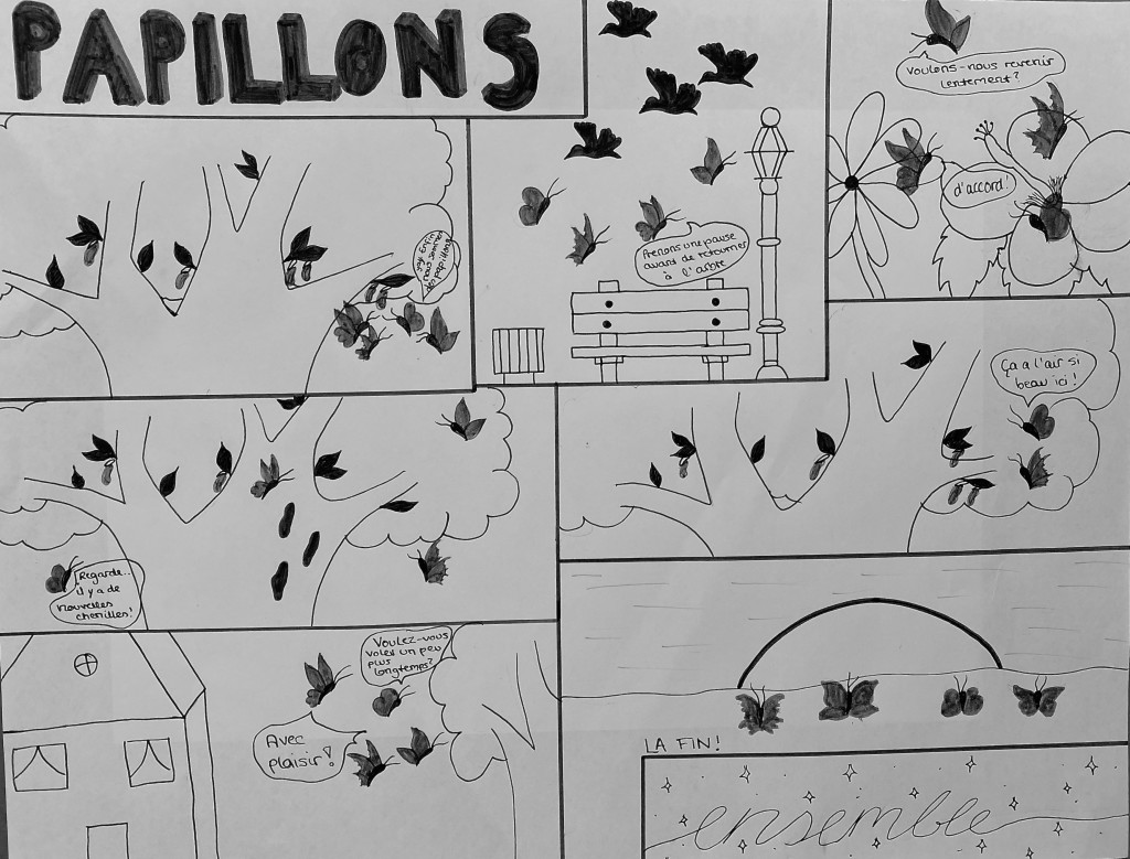 Durch einen fächerübergreifenden Unterricht (Kunst und Französisch) standen uns Frau Heller und Herr Philipp jederzeit mit Rat und Tat zur Seite. Deswegen gelang es allen Schüler und Schülerinnen in der diesjährigen Runde, wundervolle Comics zu kreieren, die sich mit der Thematik “Ensemble” (Zusammen) auseinandersetzten.