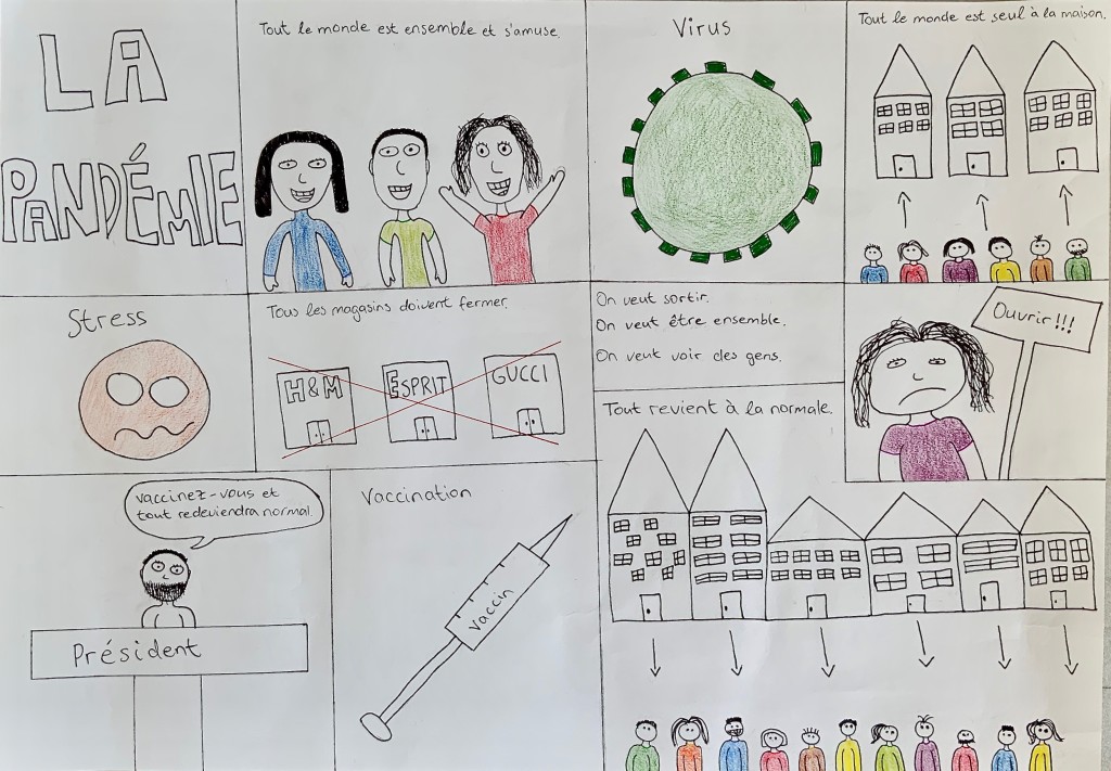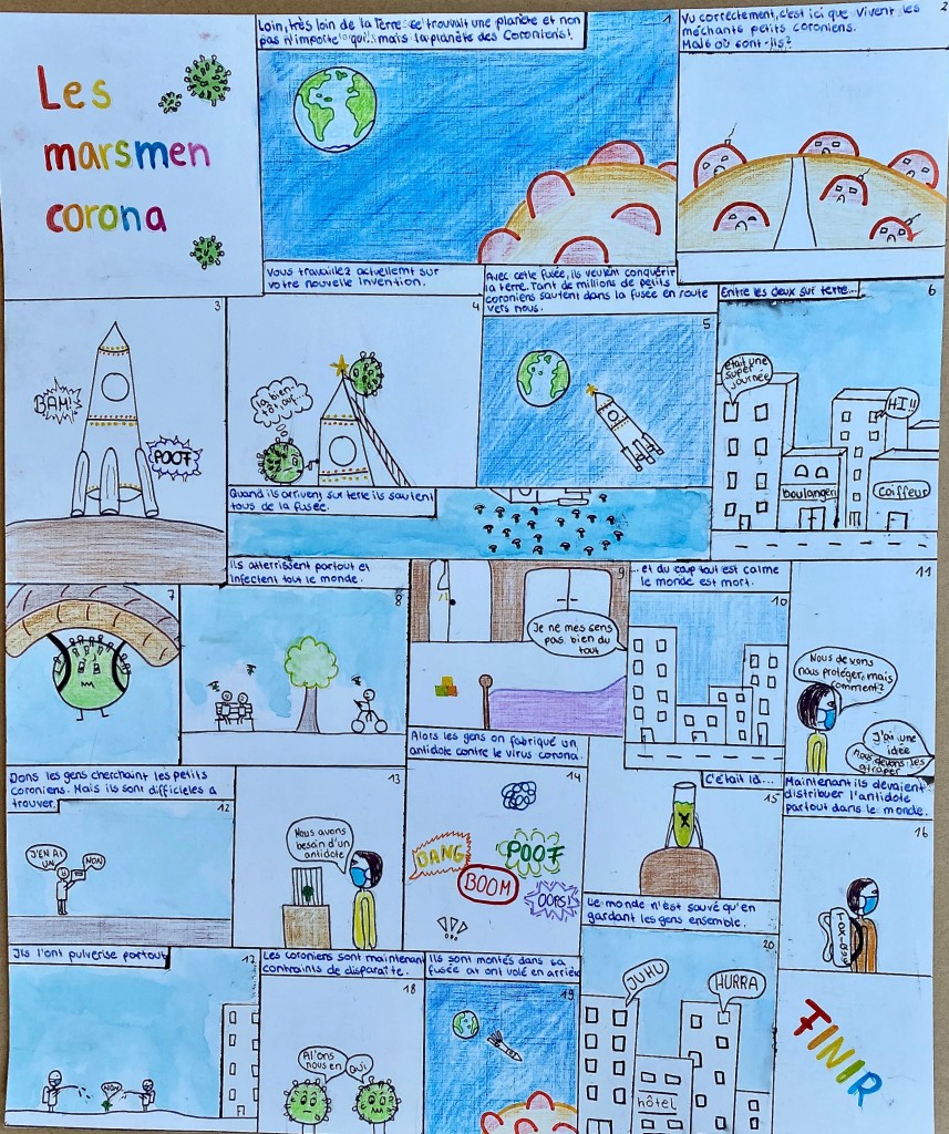 Was auch immer kommen mag, wir werden zusammen halten, egal über welche Wege. Veranschaulicht wird dies auch durch die zahlreichen Titel der Comics wie beispielsweise ” La Pandémie”, “Brad et Jimmy avec Covid” oder “Les marsmen corona”.