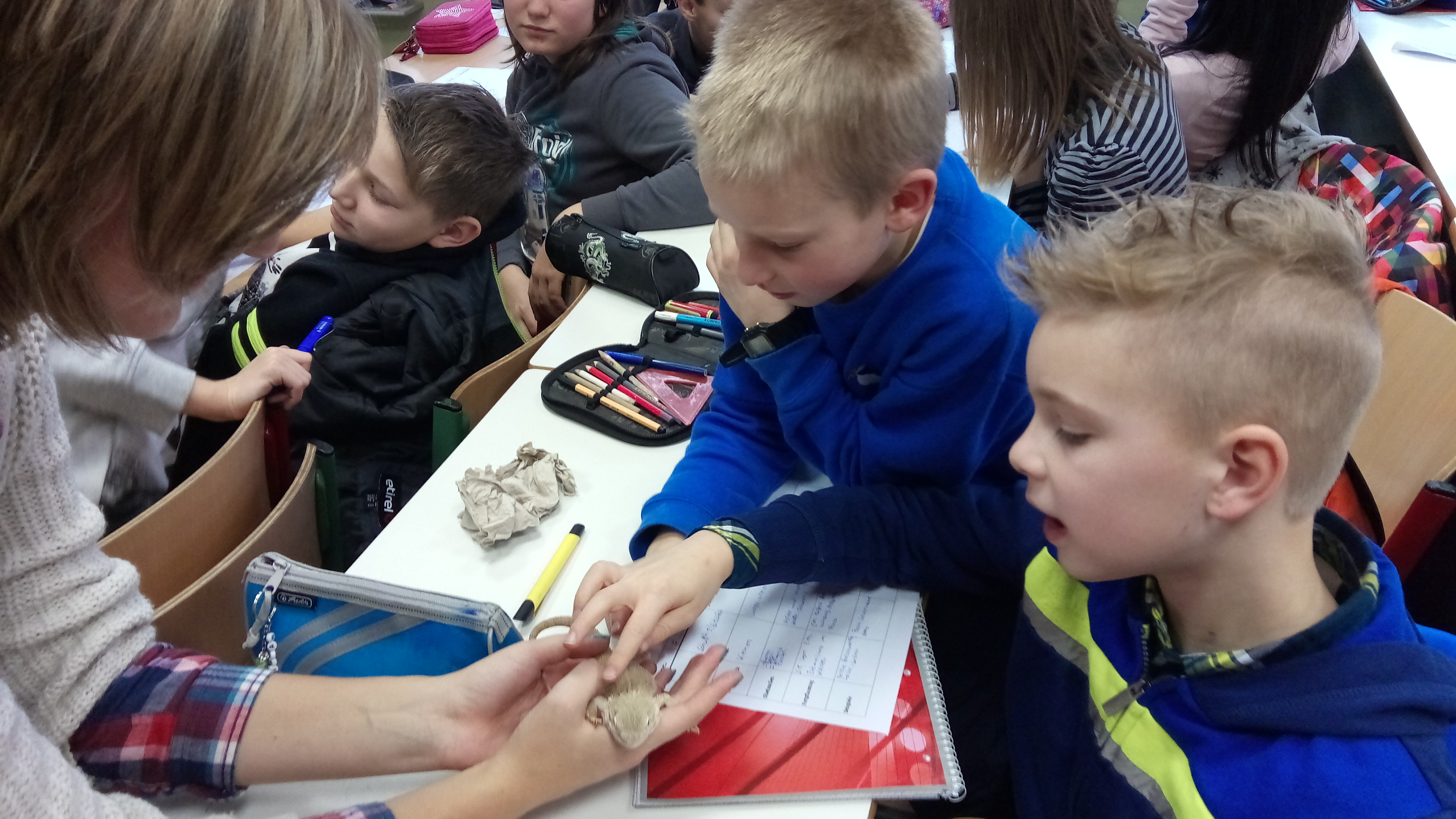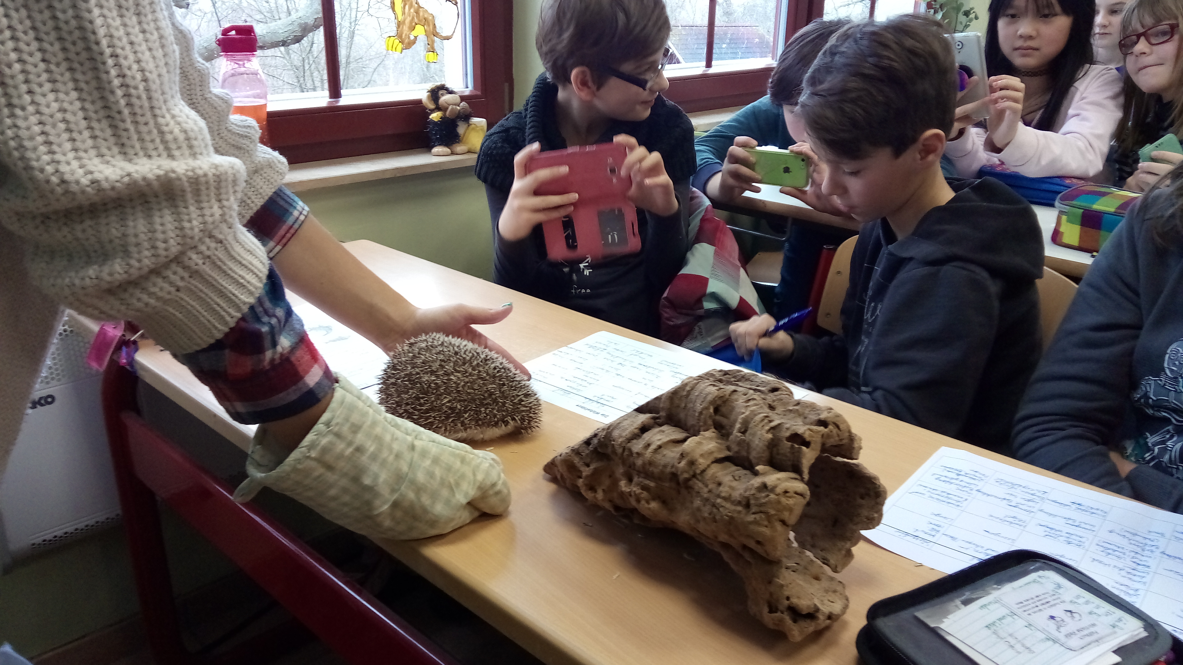 Wir, die 5. Klassen des HHG, waren am Freitag den 13.1.2017 mit unseren MNT-Lehrerinnen Frau Ridderbusch und Frau Weise in der Zooschule. Um 8.30 Uhr machten wir uns bei ziemlich verschneitem Winterwetter auf den Weg zum Zoopark. Dort angekommen, versammelte sich unsere Klasse in einem Raum mit vielen Tieren, die in Terrarien leben. Eine nette Frau erklärte uns alles, teilte Arbeitsblätter aus und half uns, diese zu bewältigen. Später hatten wir sogar Gelegenheit einige Tiere anzufassen. Das war eine sehr schöne Erfahrung. Ich berührte eine Königsboa, eine Bartagame und einen kleinen afrikanischen Igel. Wir machten im Anschluss eine kleine Tour durch den Zoo. Wir haben unter anderem das neue Elefantenhaus, das Löwengehege, den Affenberg und den Bauernhof besucht und etwas über die dort lebenden Tiere erfahren. Wir haben viel Spaß gehabt und durften sogar miterleben, wie eine Löwin eine Hyäne von der Glasscheibe vertrieben hat.